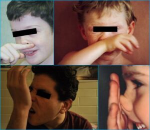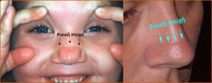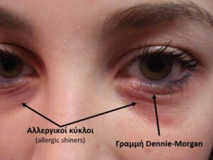 Εικ.4 Αλλεργικός χαιρετισμός[/caption] Πολύ συχνά και κυρίως στα παιδιά που πάσχουν από αλλεργική ρινίτιδα, διακρίνονται χαρακτηριστικά σημεία ή “στίγματα” της αλλεργίας, ιδιαίτερα στο πρόσωπο. Αυτά τα σημεία είναι η αλλεργική πτυχή (εικόνα 3) που είναι μια εγκάρσια πτύχωση πριν την κορυφή της μύτης λόγω της συχνής κίνησης του αλλεργικού να σκουπίσει και να ξύσει ταυτόχρονα τη μύτη του (αλλεργικός χαιρετισμός, εικόνα 4) οι αλλεργικοί κύκλοι (allergic shiners – εικόνα 5) που είναι κύκλοι με σκοτεινή χροιά γύρω και κυρίως κάτω από τα μάτια λόγω κακής φλεβικής κυκλοφορίας εξαιτίας της ρινικής συμφόρησης, μαζί με πτυχές Dennie-Morgan [caption id="attachment_2169" align="alignleft" width="208"]