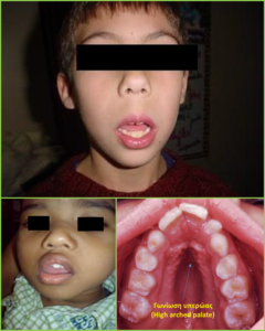 Εικ.5 Αλλεργικοί κύκλοι - allergic shiners[/caption] (εγκάρσια πτύχωση στο δέρμα των βλεφάρων) λόγω του ήπιου οιδήματος (εικόνα 5), η γεωγραφική γλώσσα και οι μεγάλες και μαλακές βλεφαρίδες. Πολλές φορές υπάρχει το χαρακτηριστικό αλλεργικό ή αδενοειδές προσωπείο (εικόνα 6) λόγω της συχνής στοματικής αναπνοής και της έντονης ρινικής συμφόρησης, όπου το στόμα είναι μονίμως ανοικτό, οι ώμοι είναι κατεβασμένοι και το παιδί έχει μια παθητική έκφραση κόπωσης λόγω της κακής ποιότητας ύπνου, που συχνά παρερμηνεύεται ως τεμπελιά και αρκετές φορές ευθύνεται για μαθησιακές δυσκολίες και μειωμένη συμμετοχή στο σχολείο. Μπορεί να υπάρχουν και ανωμαλίες της στοματικής κοιλότητας (όπως εφίππευση τομέων οδόντων της άνω γνάθου, στένωση του θόλου της σκληρής υπερώας και ανύψωσή της σχηματίζοντας ένα είδος τόξου - arched palate κ. α.). [caption id="attachment_2170" align="alignleft" width="187"]