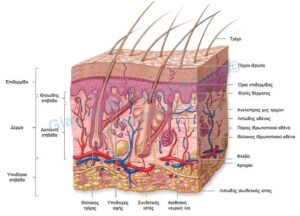 - Το δέρμα, ακρίβως κάτω από την επιδερμίδα που, μεταξύ άλλων, περιέχει ισχυρό συνδετικό ιστό, τα θυλάκια των τριχών και τους ιδρωτοποιούς αδένες.
